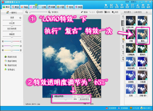 4、再选择“LOMO”特效,执行一次“复古”特效,并将该特效透明度设置为65%。
