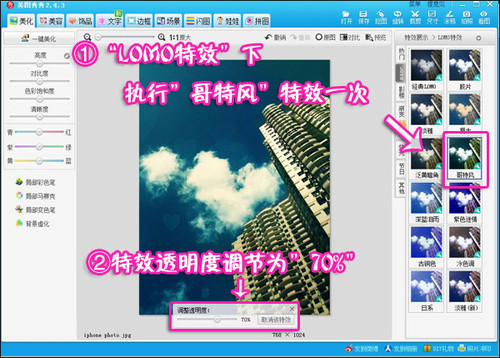 5、同样还是在“LOMO”特效下,再执行一次“哥特风”特效,并将该特效透明度设为70%。