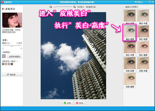1、首先在软件下打开待处理的照片,在“美白”菜单下选择“皮肤美白”,选择一键“美白-高度”。