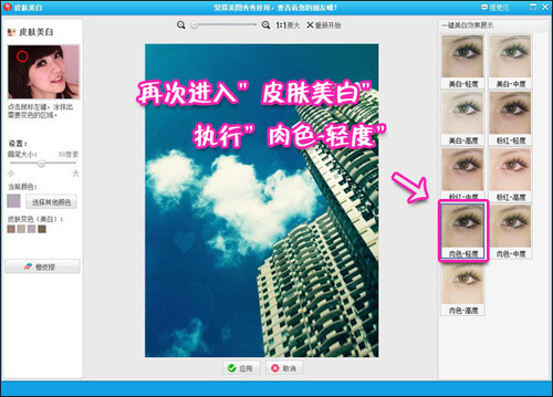 6、然后再回到“美白”菜单下,选择“皮肤美白”,执行一键“肉色-轻度”。