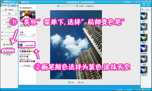 3、仍在“美化”菜单下,选择“局部变色笔”,选择画笔颜色为“蓝色”,可以在照片上天空区域内涂抹。轻松一抹就能出现一片湛蓝的天空。