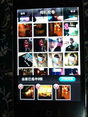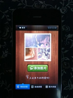 凑上去一看,界面上赫然是美图秀秀iPhone版的“拼图”!靠,居然拿他们公司内部产品来把妹,太鄙视他了。不过不看白不看,小编拿起手机把他炫耀的手机拼图界面都拍了下来,拿来研究下到底啥情况。