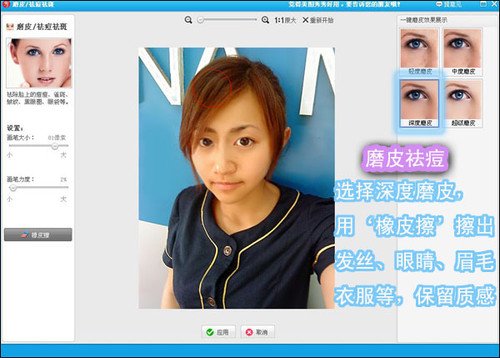 3、大致的脸形处理出来后,在选择“磨皮去痘”功能对人物的皮肤进行处理,如图4所示,执行“深度磨皮”项后,再选用“橡皮擦”功能对人物的发丝、眼睛、眉毛、衣服处进行涂沫,这样可以保留原图的质感,不至于失真!
