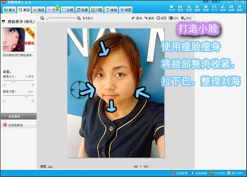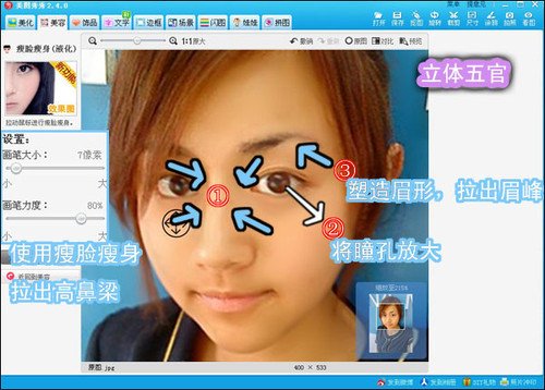 2、脸形美化后,再用“瘦脸瘦身”和“眼睛放大”功能对人物的五官进行略微的美容,如图3所示,注意画笔的大小和力度。