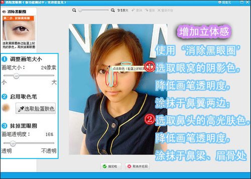 5、这样一看,人物的气色就好多啦~接下来就是细节的优化了,选择“消除黑眼圈”功能,增加五官的立方体感,如图所示。