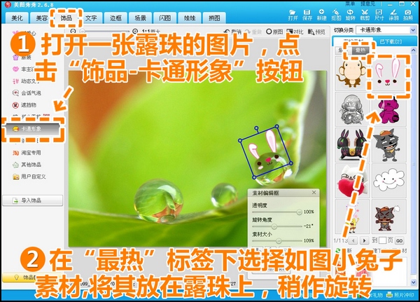1、在软件中打开露珠图片,进入“饰品”菜单,选择“卡通形象”按钮,在“最热”标签下找到小兔子素材,把它放置在露珠上,稍稍调整旋转角度,让小兔子看起来更俏皮生动。