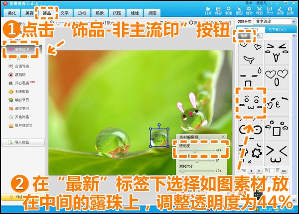 2、同样在“饰品”菜单下,点选“非主流印”,在“最新”标签下选择如图表情素材,放在另一颗露珠上。因为距离比较靠后,所以要调整透明度为44%,让它更虚化一点,看起来更加真实自然。