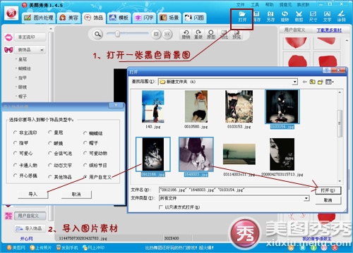 首先打开一个黑色背景图,并把素材图片导入“饰品”标签里的“用户自定义”中。
