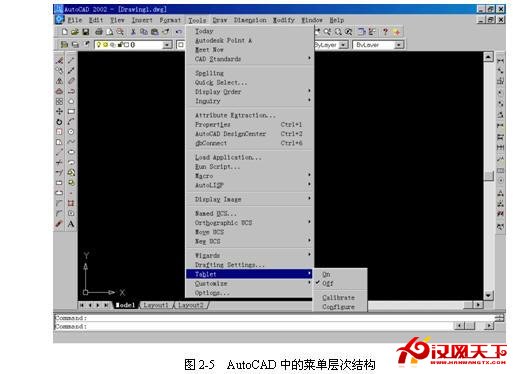 AutoCAD中的菜单栏为下拉菜单,是一种级联的层次结构。在AutoCAD窗口的菜单栏中所显示的为主菜单,用户可在主菜单项上单击鼠标左键弹出相应的菜单项。例如单击菜单栏中的【Tools(工具)】菜单,如图2-5所示。