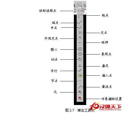 有的工具栏图标的右下角有一个小三角形符号,它表示单击该图标后将弹出一个由多个子命令图标组成的弹出工具栏,如图2-7所示。如果选择了弹出工具栏中的某一个图标,那么该图标将位于弹出工具栏的顶部,并成为默认的选项。