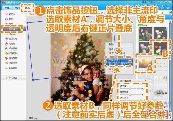 3.然后进入“饰品”菜单,在“非主流印”分类中,选取下图标注的素材A调节其大小、角度和透明度,右键正片叠底;接着选择素材B,复制一份放置背景处,同样调节素材的大小、角度和透明度,其间注意素材的前实后虚,右键全部合并。