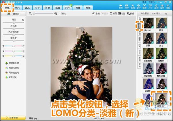 1.在“美图秀秀”软件下打开待处理的情侣合影,进入“美化”菜单下,选择lomo分类-淡雅(新),可以瞬间调节画面的色调和亮度。