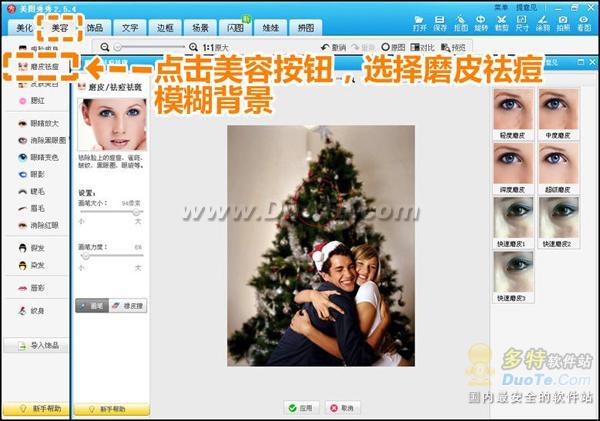 2.接着进入“美容”菜单下,选择“磨皮祛痘”功能,调节合适的画笔大小与适当的画笔力度,涂抹背景使其适当模糊,制造景深,突出的情侣人物。同时还可以适当优化人物的皮肤。
