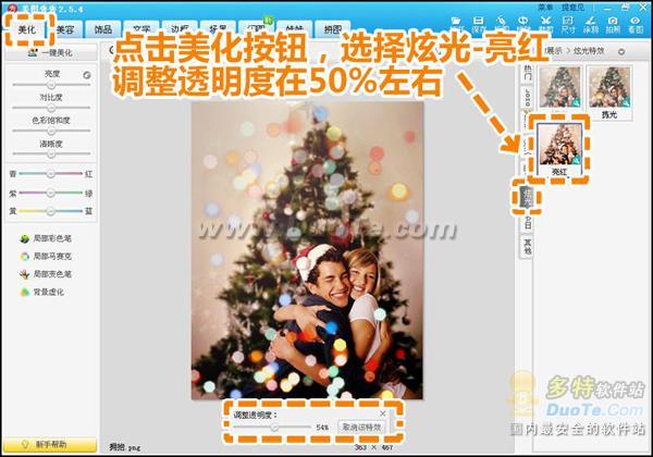 4.再进入“美化”菜单下,选择“炫光”分类中的“亮红”特效,并将透明度调到50%左右。