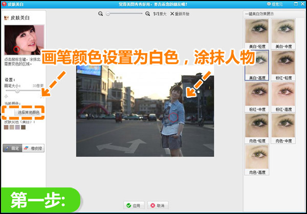打开原图后,点击“美容”菜单,选择“皮肤美白”.将画笔颜色设置为白色,涂抹人物。