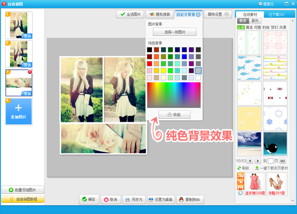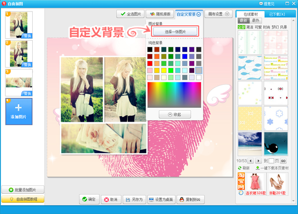 而 “自定义背景”设置,能让用户轻松实时预览和选择纯色背景效果(如图2),或者换一张自己存的图片做背景(如图3),让用户充分发挥DIY的拼图乐趣。