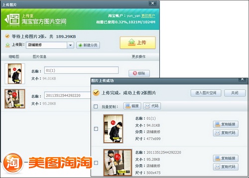通过美图淘淘批量完成图片美化后,即可批量生成图片保存到本地硬盘,或本地一键上传到淘宝官方图片空间;通过美图淘淘程序接口,即可直接登陆。然后,挑选要上传的图片及选定上传的路径,即可开始上传;完成上传后可一键复制图片链接到需要的地方,也可方便的进入在线图片空间,如图04.