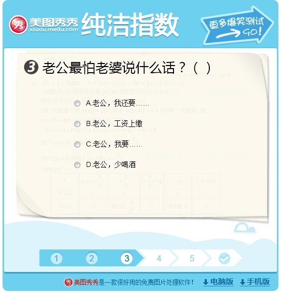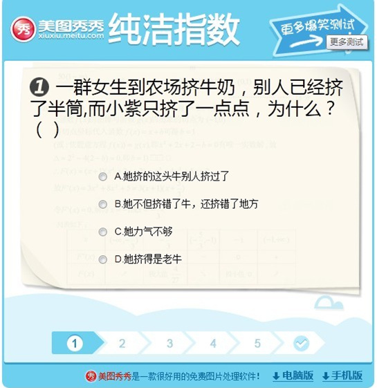 在参加测试前,请跟着小编默念三遍“世界这么乱,装纯给谁看……”,未满18岁的童鞋们请在父母指导下参与答题。言归正传,看官们请先进入美图秀秀纯洁指数测试网址:http://12.app.meitu.com/,题目非常多,每次只能做5道,可以重复做,全程佚名保密哦。