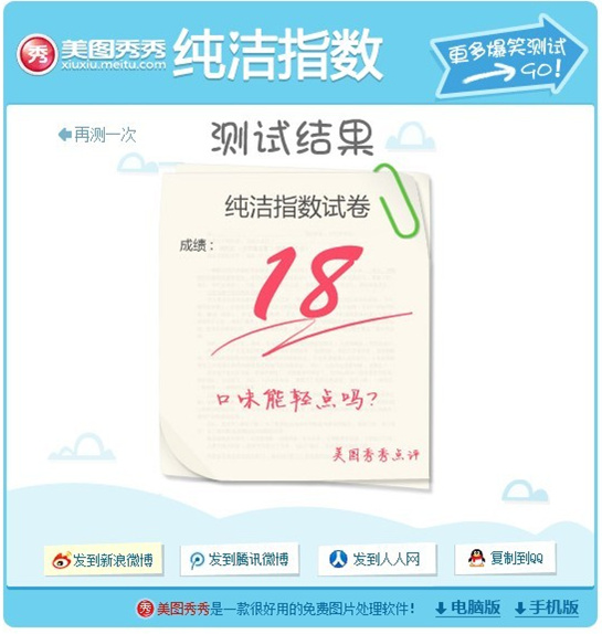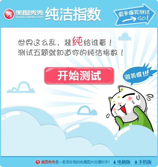 据悉,荣获“砖家精神文明建设钻石奖”的“美图秀秀纯洁指数”测试旋风来袭,不如和小编参加这次测试,看看各位的“纯洁指数”到底还有多少……