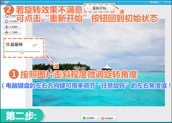 2、进入旋转处理界面后,先按照图片倾斜程度微调一下“任意旋转”的角度,可以选择用鼠标拖拽滑块来调节图片旋转角度,也可以用电脑键盘的左右方向键来调节。当然,如果旋转的效果不够满意,可以点击界面上方“重新开始”按钮回到初始状态。