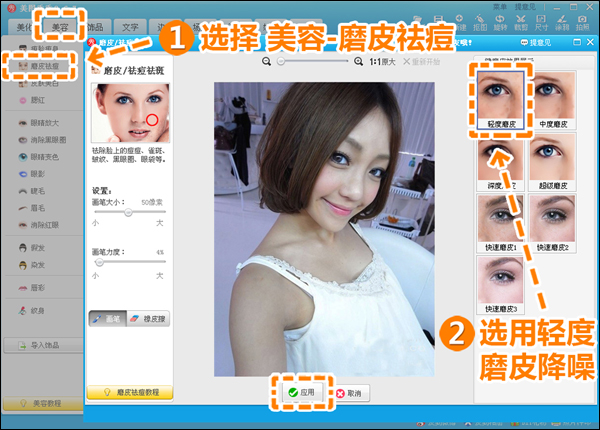 在美图秀秀中打开一张自拍照。首先点击“美容”-“磨皮祛痘”,使用“轻度磨皮”抹去脸上的细小斑点,随便降噪哦。