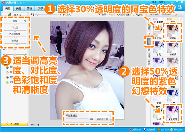 接下来给照片做一些美化处理。先使用30%透明度的“阿宝色”特效和50%透明度的“紫色幻想”特效,再适当调高照片的亮度、对比度、色彩饱和度以及清晰度。并保存图片备用。