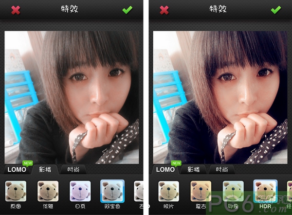 接下来将要进入图片美化的重头戏--选择特效,点击屏幕下方的特效按钮,选择喜欢的特效后就可以在屏幕中间看到这个特效作用在照片上的效果了。还可以直接在照片上左右滑动手指,可以切换特效。