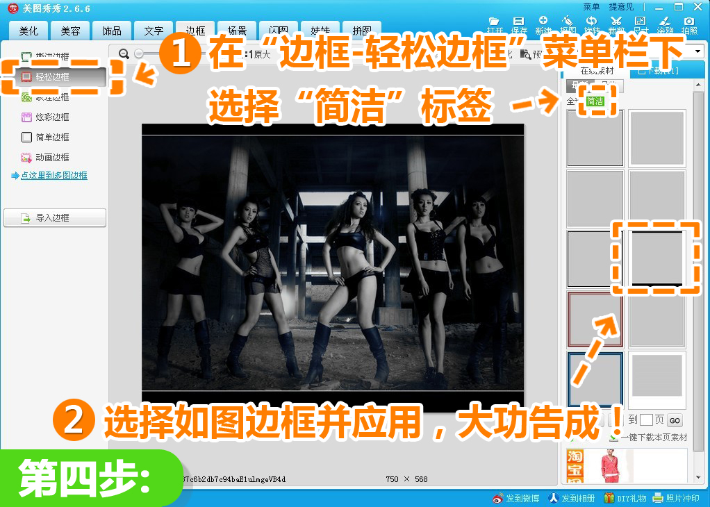 4、然后进入“边框”菜单下,选择“轻松边框”分类,点击“简洁”找到如下图的边框素材,然后点击“应用”就大功告成了。