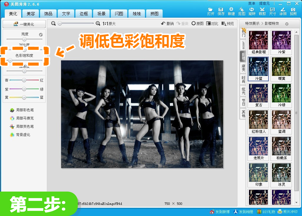 2、经过上一步“冷蓝”特效的处理,可能有点偏色,适当降低“色彩饱和度”,打造偏蓝色的淡彩效果。