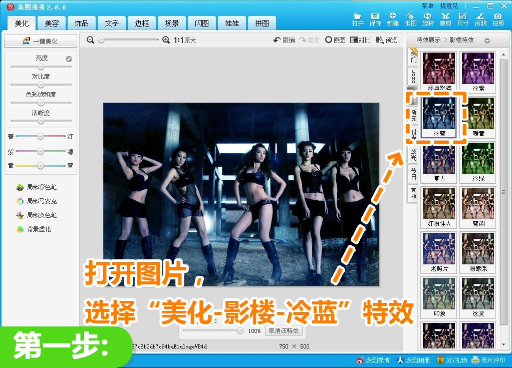 1、在软件下打开待处理的照片,进入“美化”菜单下,选择“影楼-冷蓝”特效,并将透明度默认为100%,一键轻松更改照片的色调。