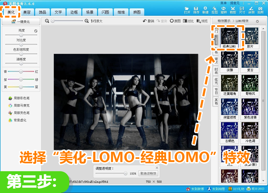 3、接着选择“LOMO”特效分类下的“经典LOMO”特效,使照片有酷酷的暗角效果。