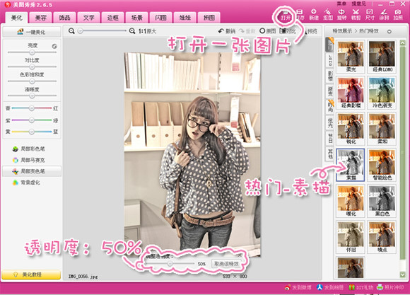 第一步:打开一张要处理的照片,先使用美图秀秀的“素描”特效,并将透明度调节为50%(图3)。