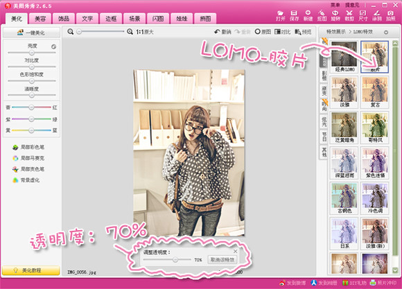 第二步:在用“lomo”分类下的“胶片”特效加强明暗的对比,这里也要调节透明度为70%哦(图4)。