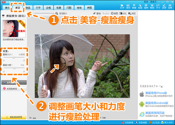 1.在美图秀秀中打开一张雨天照片。首先点击“美容”—“瘦脸瘦身”,对人物脸部进行瘦脸处理(图3)。