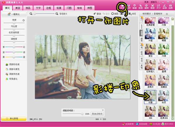 第一步:先启动“美图秀秀”软件,打开一张待处理的图片,在“美化”菜单下,选择“影楼”分类下的“印象”特效。