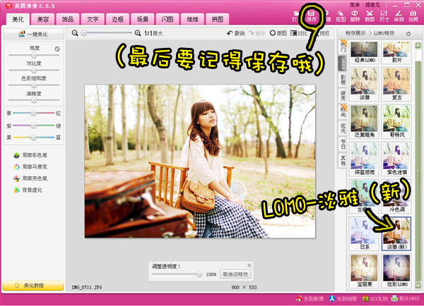 第三步:最后点击“LOMO”分类,选择“淡雅(新)”特效,就大功告成咯!