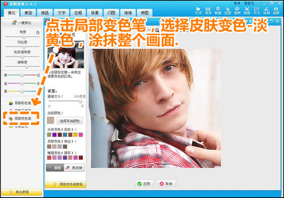 3.同样在“美化”菜单下,点击“局部变色笔”按钮,选择皮肤变色,选黄色系颜色,涂抹整个画面,让照片蒙上一层暖暖的阳光。