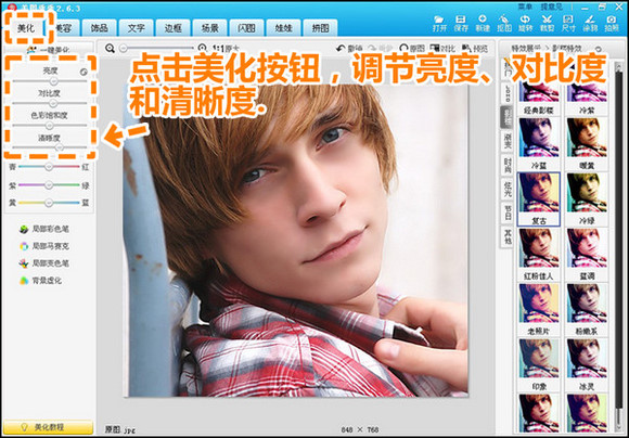 2.接着返回“美化”菜单下,在左侧功能栏中适当地调节亮度、对比度、清晰度。