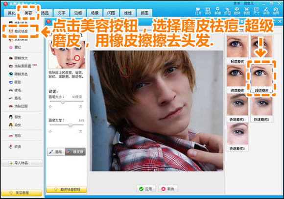 1.启动“美图秀秀”软件,进入“美容”菜单,选择“磨皮祛痘-超级磨皮”,在再用橡皮擦擦去头发、眼睛等部位,还原五官细节。