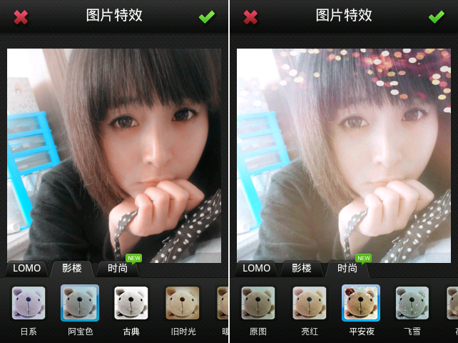 打开一张图片经过适量裁减后,就可以进入图片美化的重头戏--特效。点击屏幕下方的特效按钮,选择喜欢的特效后就可以在屏幕上看到作用在照片上的效果了。还可以直接在照片上左右滑动手指,用以切换特效。