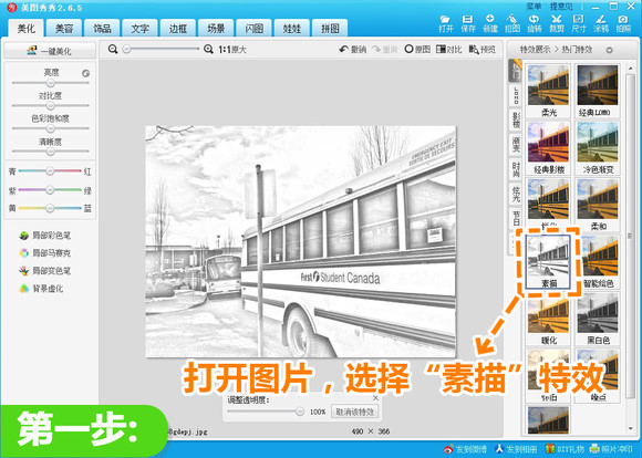 1.打开原图后,进入“美化”菜单下,选择“热门”特效分类里的“素描”,并默认透明度为100%。