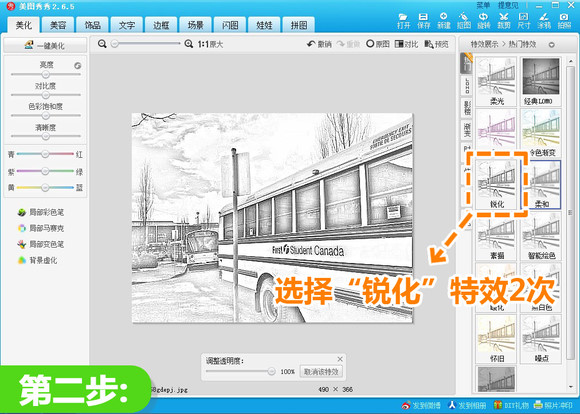 2.为了让素描的线条效果更加明显,可以添加2次“锐化”特效,2次的锐化透明度均默认为100% 。