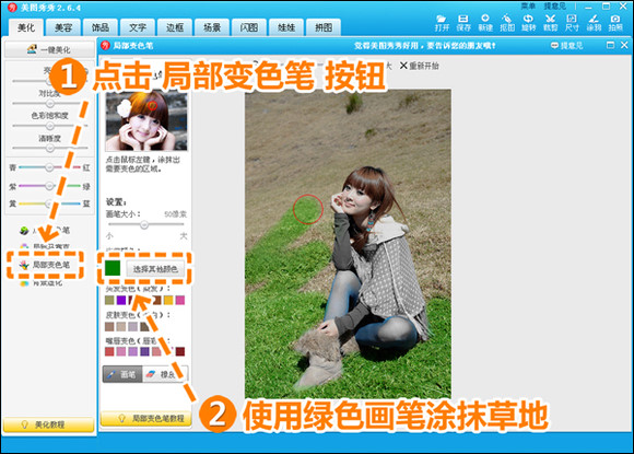 1.在美图秀秀中打开待处理的照片。点击“局部变色笔”按钮,使用绿色画笔涂抹枯黄的草地(图2)。