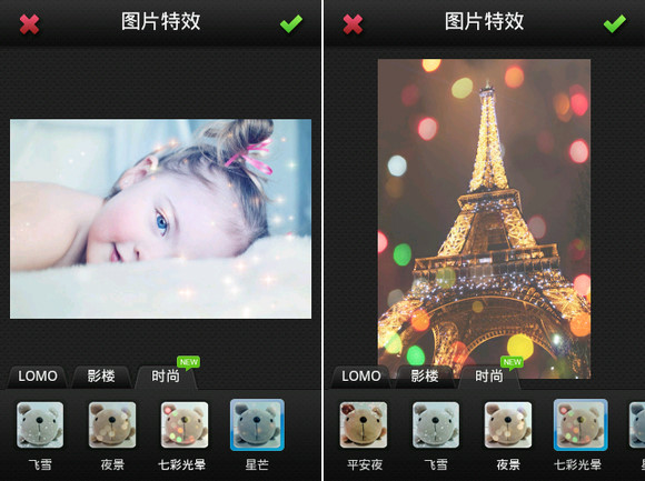 大家喜闻乐见的一键特效又有更新,新增了“时尚”分类的“七彩光晕”特效(图3左),和原来存在的“夜景”特效相比更充满了七彩光亮的动感(图3右)。