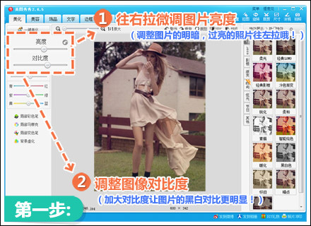 1、打开“美图秀秀”软件,在“美化”菜单下,可以看到左侧图片调色的一些常用功能。一些数码相机的拍照效果容易受光线的影响,当色调偏暗偏亮时可以选择调节图片“亮度”。但是亮度的调节会影响图像的层次感,这时再适当地调高“对比度”,就可以让图片显得更加生动(图2)。