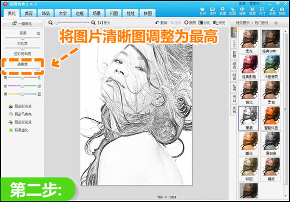 2.为了让素描效果中的线条感更加明显,可将图片的清晰度调整到最高。