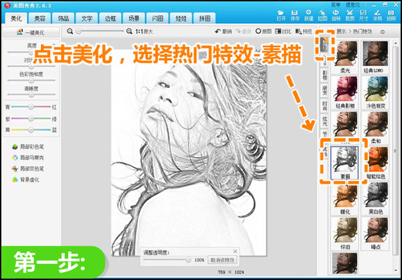 1.先启动“美图秀秀”软件,打开原图后,进入“美化”菜单下,选择“热门特效”里的“素描特效”,一键速成相当简单哦。