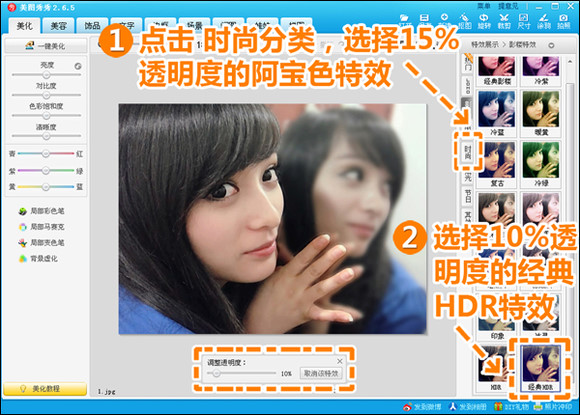 4.最后分别使用15%透明度的“阿宝色”特效和10%透明度的“经典HDR”特效,就完成啦。这一步亲们也可以根据自己的喜好来添加特效哦(图5)。