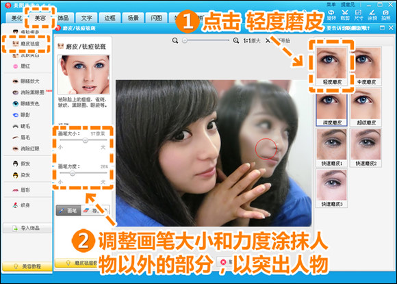 2.点击“美容”—“磨皮祛痘”,先使用一次“轻度磨皮”,再调整画笔的力度和大小涂抹人像以外的部分,以达到突出人像的效果(图3)。