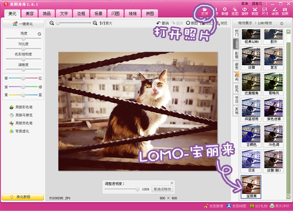 1、在“美图秀秀”软件中打开待处理的照片,直接进入“美化”菜单下,选择“LOMO”分类下的“宝丽莱”特效。